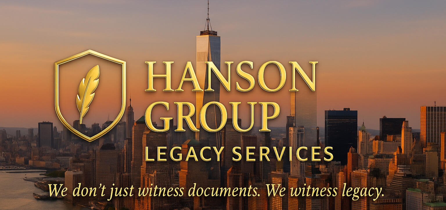 At Hanson Group Legacy Services, we believe notarization is more than a formality — it’s a vital step in safeguarding your legacy. Whether you're closing on a home, finalizing an estate plan, or verifying a vital document, our mission is to make the process smooth, secure, and respectful of what matters most.Founded in New York, our business is built on professionalism, discretion, and a deep commitment to service. Every appointment is handled with precision, integrity, and care.